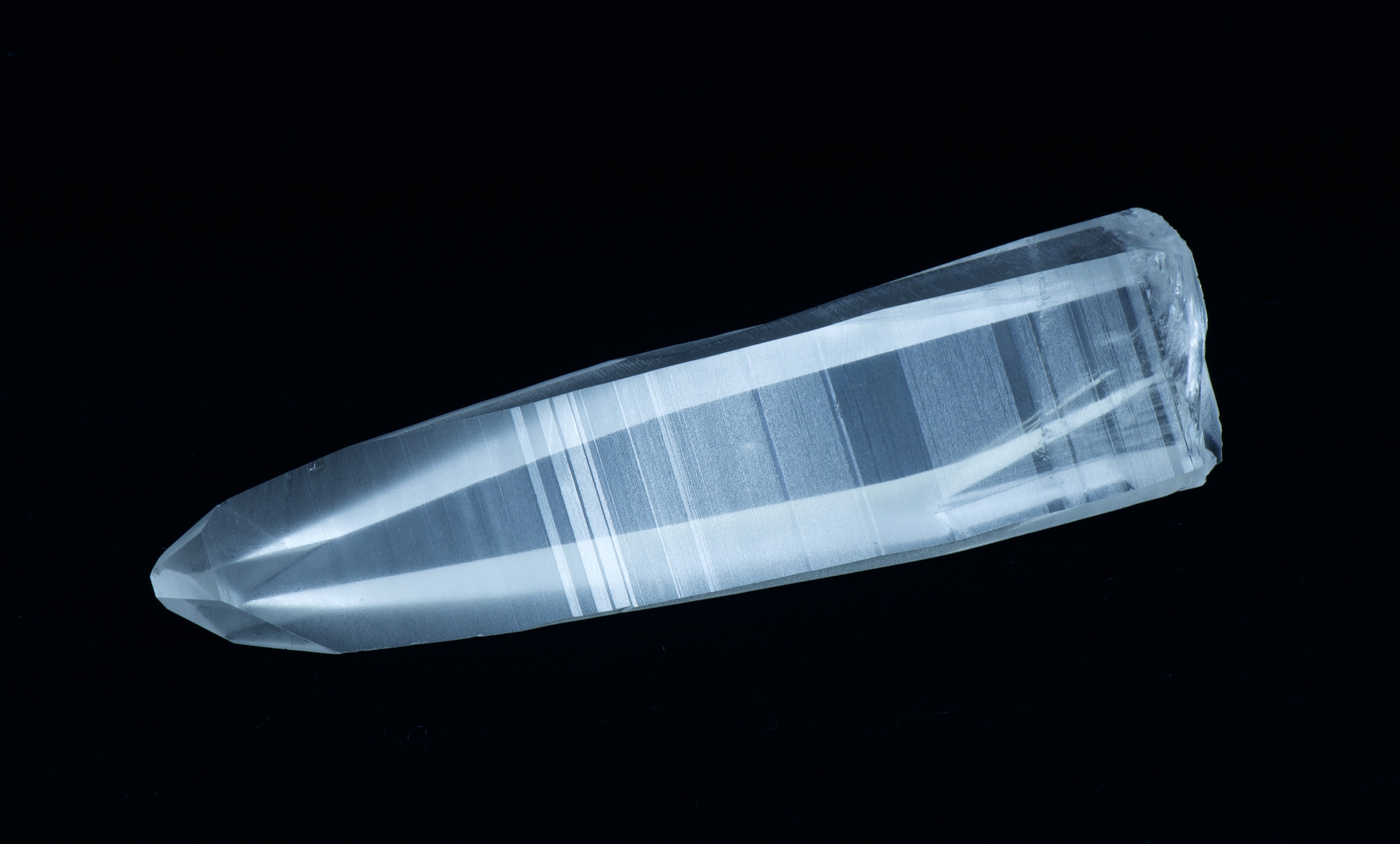 The most recognizable feature of a Lemurian crystal is its series of horizontal striations — often referred to as Akashic lines. Even when only fractions of a millimeter wide, these alternating ridges and smooth planes create a tactile rhythm along the crystal’s surface.