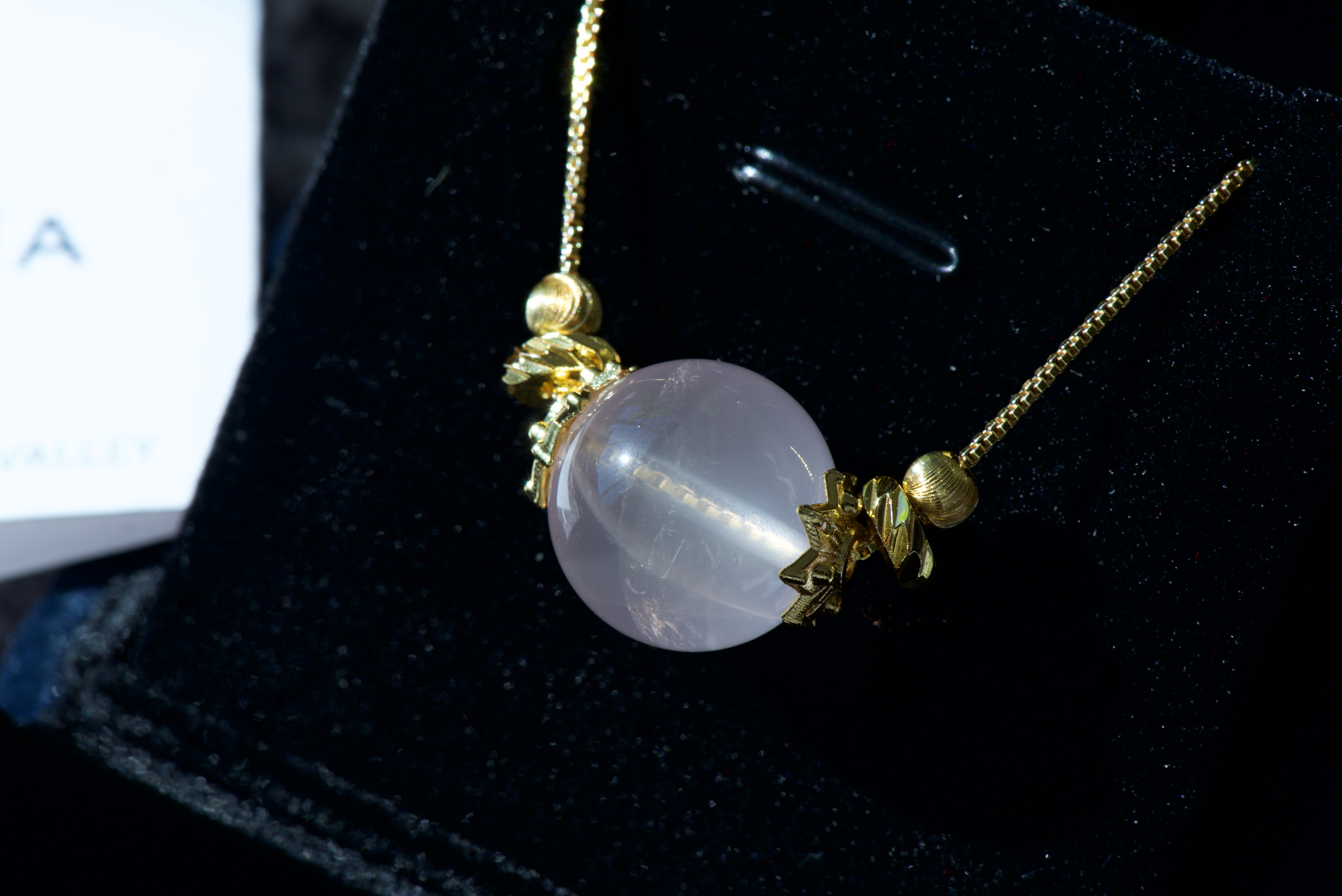 Crafted from gem-quality Rose Quartz with rare glowing transparency, this piece softens emotional armor to invite intimacy and self-acceptance. Framing the hand-polished sphere are delicate floral caps and cat-eye beads on a bespoke 17 1/4" adjustable high-color-retention gold chain. An enlightening design that aligns with the Sacral Chakra to foster heart-centered frequency and manifest a life of deep emotional fulfillment.